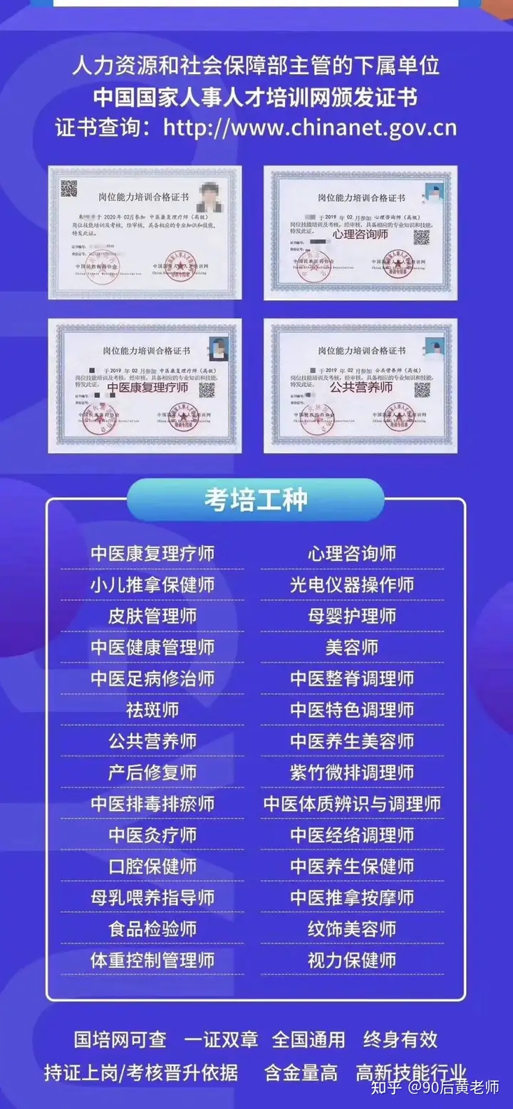 中医特色调理师、中医推拿按摩师、中医康复理疗师、中医健康管理师、中医整脊调理师、中医养生保健师、中医足病修治师、中医排毒排瘀师、中医生殖健康咨询师、中医体质评估调理师、中医养生美容师、中医灸疗师、皮肤疤痕修复师、小儿推拿保健师、母乳喂养指导师、光电仪器操作师、体重控制管理师、辟谷养生指导师、虹膜全息健康咨询师、视力保健师、母婴护理师、产后修复师、皮肤管理师、公共营养师、纹饰美容师、紫竹微排调理师、养老护理师、心理咨询师、高级美容师、眼镜定配技师、眼镜验光技师、口腔保健师、食品检验师、高级育婴师、高级祛斑师、古法采耳师。