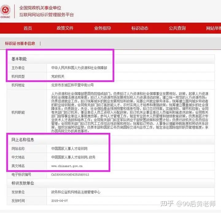 我们点击“党政机关”图标,进入 全国党政机关事业单位互联网网站标识管理服务平台,通过平台可以看到,中国人事人才培训网为人力资源与社会保障部直属国家培训网站。