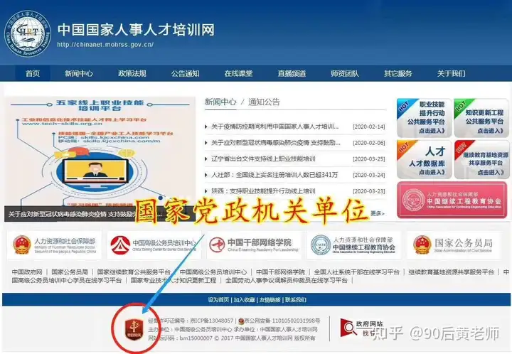 同时我们通过 中国国家人事人才培训网站底部可以发现,党政机关单位网站专属图标,说明该网站为国家党政机关单位的网站