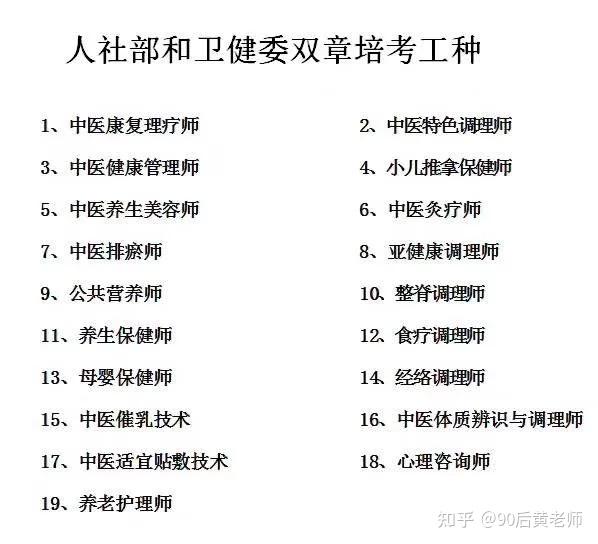口腔治疗师、口腔修复师、口腔种植师、口腔正畸师、影像技师、卫生检验师、康复理疗师、中医刮痧师、中医按摩师、中医健康管理现、视力康复师、中医灸疗师、中医理疗师、小儿推拿保健师、中医催乳师、经络调理师、中医传承专项技师、中医特色疗法专项技师、中医传承非遗技师、母婴照护师、养老护理师、病患照护师、残疾人照护师、食品检验师、心理咨询师、公共营养师、口腔健康管理师、生殖健康管理现、整脊调理师、美容保健师、护理管理师、医养结合管理师、环境健康维护师、公共卫生管理师!