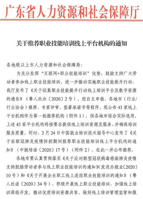 为充分发挥“互联网+职业技能培训”优势,鼓励支持广大劳动者参加线上职业技能培训,进一步推动实施职业技能提升行动,广东省人力资源和社会保障厅发布了《关于征集职业技能提升行动线上培训平台及数字资源的通告》(粤人社办[2020]2号),经自主申报,各地市(行业/行业协会)推荐,专家评审等程序,于近日公布43家线上平台机构作为第一批推荐机构。