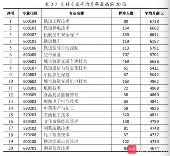毕业专科专业薪酬方面:从国家设置的标准专业看,平均月薪最高的是铁道工程技术,为6718元;其次是铁道供电技术,为6662元;第三是民航空中安全保卫,为6611元。