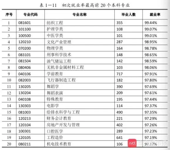 本科生方面,本科毕业生初次就业率为93.44%,比2018年减少了0.40个百分点。从国家设置的标准专业(毕业生人数在100以上)看,就业率最高的是纺织工程,其次是护理学类,第三是中医学类。就业率最高前20名中,属工科类的专业最多,有7个。