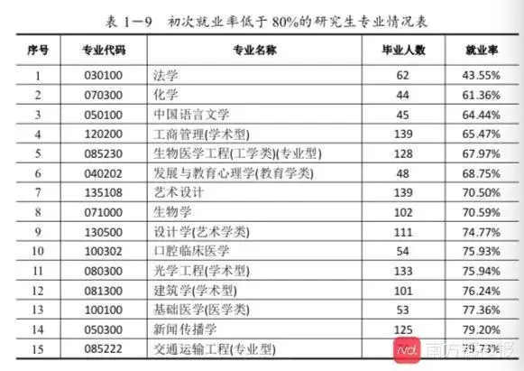 就业率低于80%的专业(毕业生人数大于等于40)有15个,就业率最低的是法学,为43.55%;其次是化学,为61.36%。