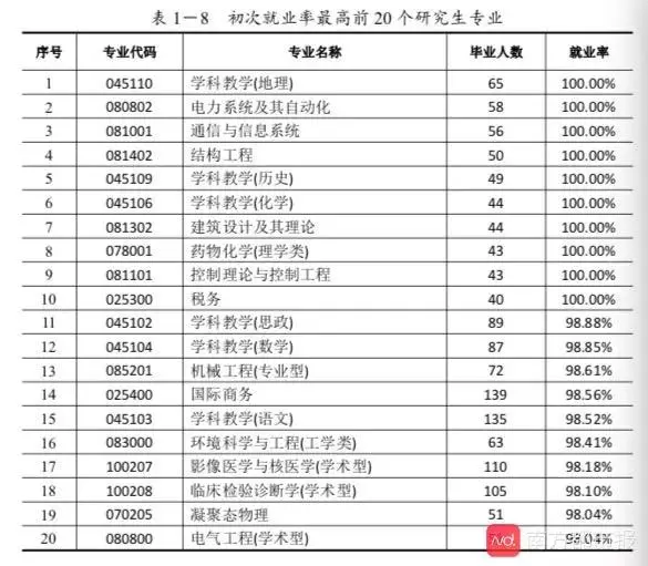 研究生方面,毕业研究生初次就业率为91.26%,比2018年减少了2.26个百分点。从国家设置的标准专业看,就业率为100%的专业(毕业生人数大于等于40)有10个,属工科类的专业最多,有5个。