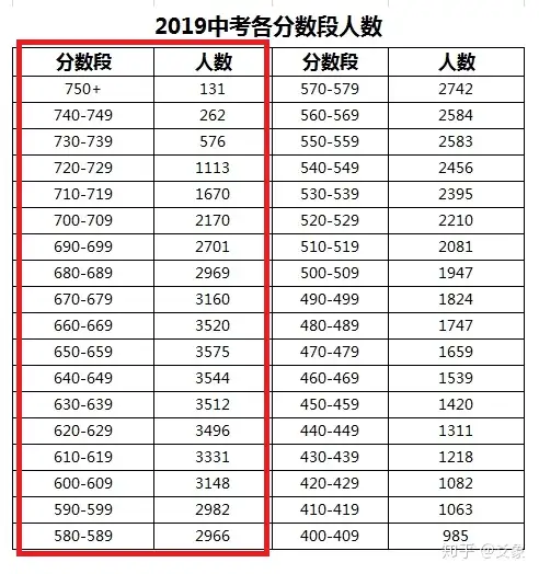 爻老师用红色框圈了一下,如果考了580分,在2019年广州市的中考排名就已经排到了50%,再低一些就很难读到普通高中,所以最低也要580分。