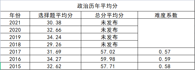 近些年政治全国总分平均分基本在57-60分之间,波动不大。