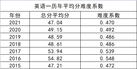 2021届考研英语一的难度同2015届持平,总分平均分低至47.04。
