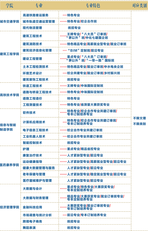 学校设有铁道工程技术、建筑工程技术、建筑消防技术、软件技术、护理、财务管理、高铁乘务等60多个特色专业方向,建有300多名教授、高级工程师、企业家和技术骨干组成的双师资源库。