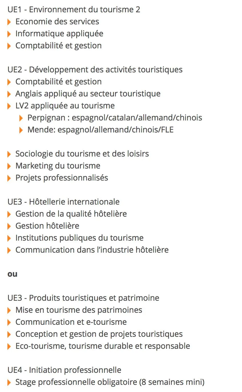 公立大学体系中,一般在经管专业(économie et gestion)本科第三年分方向,本科开设有旅游管理专业的学校有:尼斯大学,佩皮尼昂大学,萨瓦大学,蒙彼利埃大学,昂热大学,图卢兹二大等,今天主要向大学介绍呼声比较高的佩皮尼昂大学Management du tourisme及萨瓦大学的Tourisme, Hôtellerie, événementiel专业。