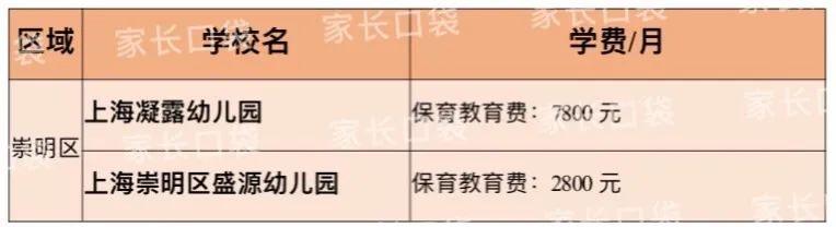 崇明区的民办幼儿园学费水平明显低于主城区,除了下表中两所热门的民办园,区内更多的民办园价格水平维持在2000-3000元/月。比较有代表性的就是盛源幼儿园,而像凝露幼儿园这样的高端园,在崇明区是比较少的。