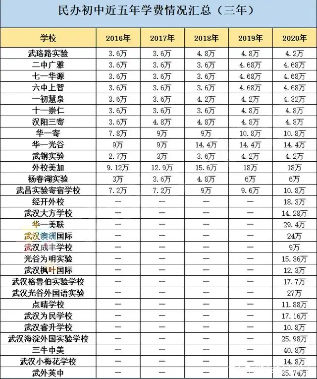 公参民的7所学校整体和往年变动不大,纯民办的学校也和去年持平,私立的学校学费则是一如既往的贵,其中三牛中美的学费和住宿费加起来更是触碰到武汉的初中学校的天花板,价格突破40万!