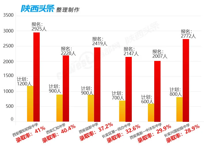 西安爱知初级中学计划招生1200人,报名人数2925人,录取率约为41%;