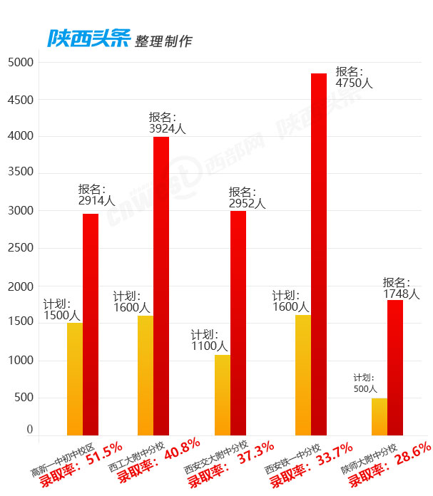通过梳理,西部网、陕西头条记者发现,报名人数最多的学校为西安铁一中滨河校区,该校计划招生1350人,报名人数达到了5332人,录取率约为25.3%。备受关注的五所热点学校中,高新一中初中校区录取率最高,约为51.5%;陕师大附中分校录取率最低,约为28.6%