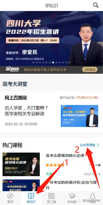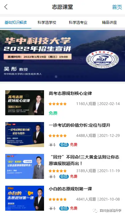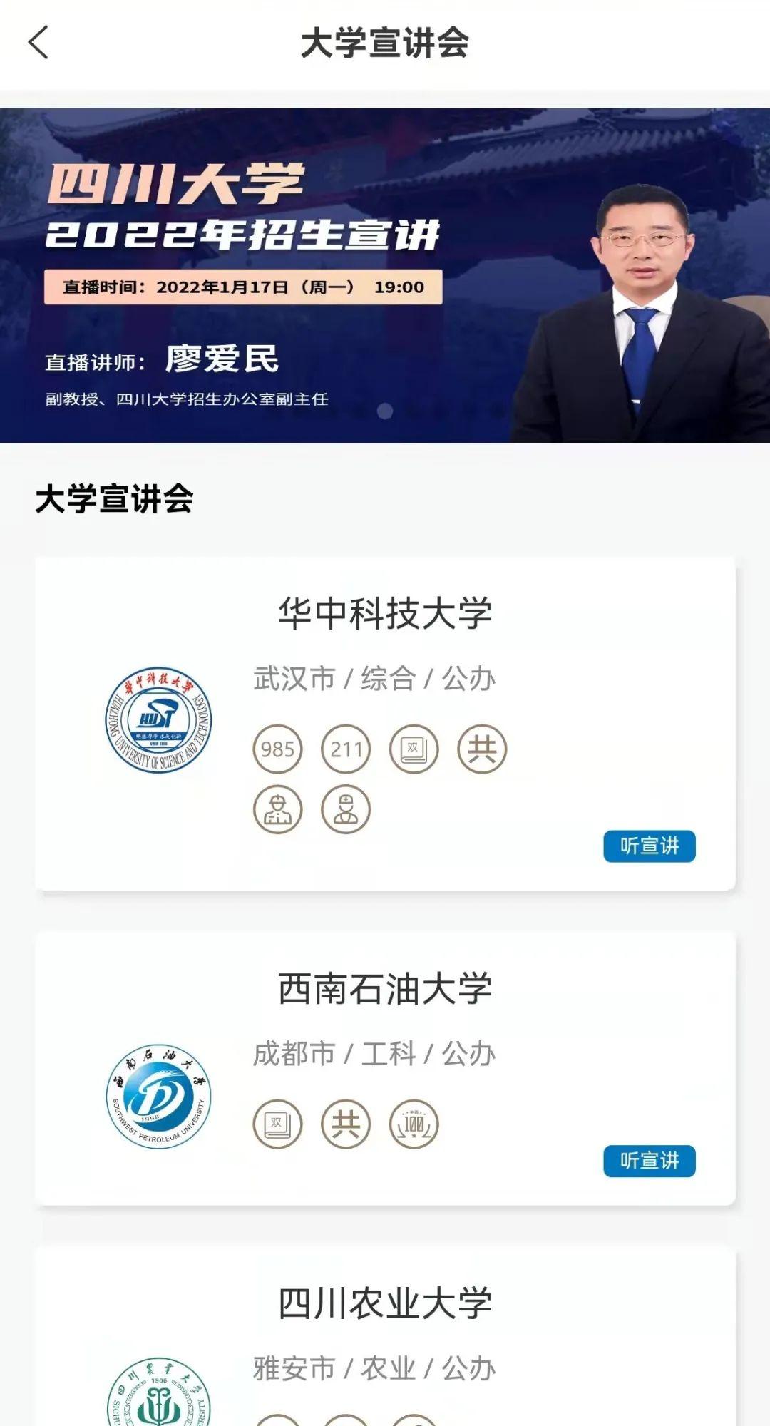 高考志愿课堂除了有专业的高考志愿规划老师讲解高考志愿填报的基础知识、方法、技巧,还有部分高校老师(包括清华、上海交通大学、西安交通大学、北京理工大学、国际关系学校、华中科技大学、华南理工大学、四川大学、电子科技大学、大连理工大学、四川农业大学、西南石油大学等高校)详细讲解高校的招生政策、特色专业等,助您科学选大学和专业。
