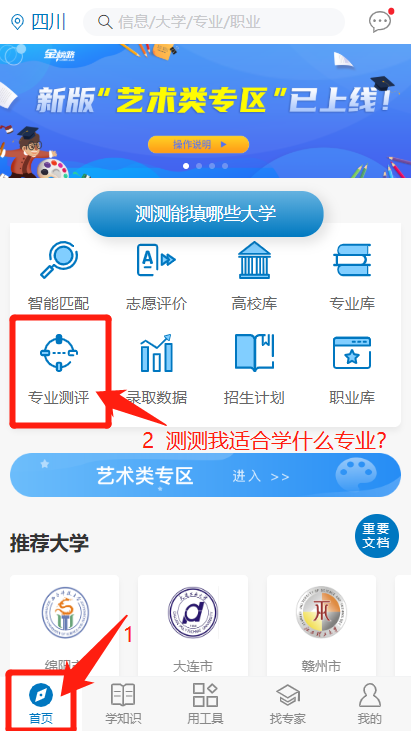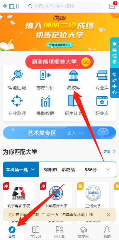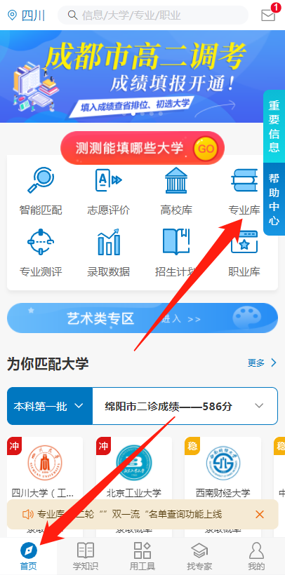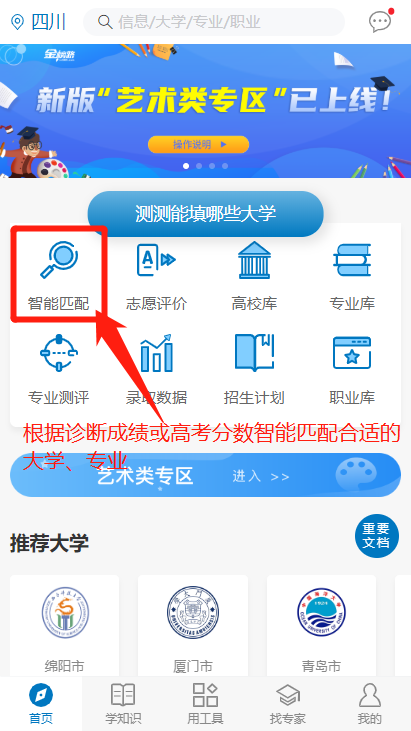 登录金榜路,点击智能匹配,系统会根据你的高考成绩智能匹配合适的大学和专业。在高考成绩出来前,可输入诊断成绩进行筛选目标大学、专业,为高考志愿填报做充分的准备。