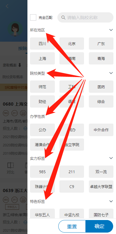 还可以点筛选,按地区、院校类型、办学性质、实力标签、特色标签进行智能匹配。