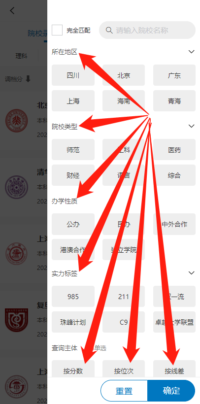 还可以点击筛选,按所在地区、院校类型、办学性质、实力标签、按分数、按位次、按线差进行查询。