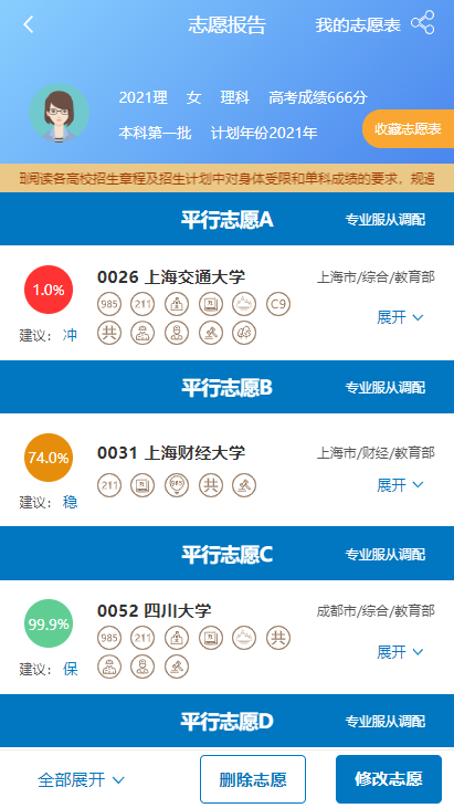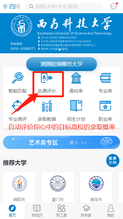 登录金榜路,点击志愿评价,录入拟填志愿方案,系统对拟填的方案进行智能评估,给出院校和专业录取的概率。