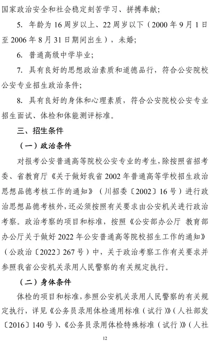 根据教育部、公安部有关要求,为保证招生质量,结合四川省实际,特制定四川省2022年公安普通高等院校公安专业本专科招生面试、体检、体能测评和政治考察工作办法。