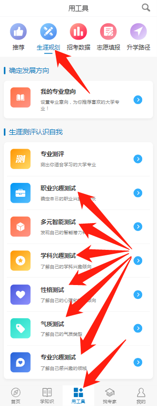 还可以点击用工具---生涯规划,进行职业兴趣测试、多元智能测试、学科兴趣测试、性格测试、气质测试、专业兴趣测试认识自我、确定职业方向。
