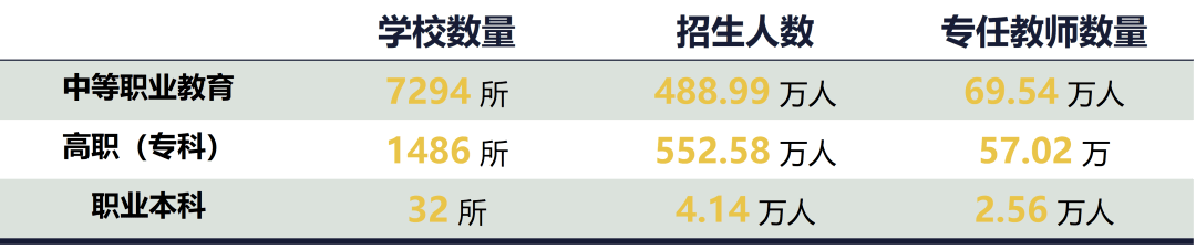 根据2021年全国教育事业发展统计公报,到2021年,三类职业学校数量为8812所,专任教师数量达129.12万人,每年培养超1000万的高素质技术技能人才,为中国先进制造业和各类战略新兴产业输入新鲜血液。除此之外,全国总量1万余所的职业学校开设了1300余个专业和12余万个专业点,基本覆盖了国民经济各领域,每年开展各类培训上亿人次。