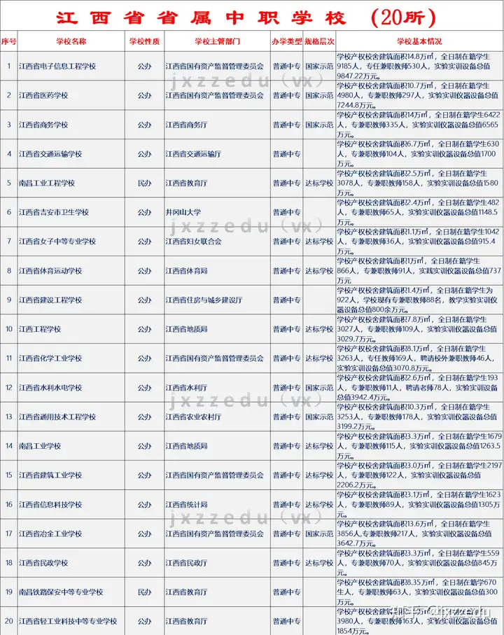 江西省电子信息工程学校江西省医药学校江西省商务学校江西省交通运输学校南昌工业工程学校江西省吉安市卫生学校江西省女子中等专业学校江西省体育运动学校江西省建设工程学校江西工程学校江西省化学工业学校江西省水利水电学校江西省通用技术工程学校南昌工业学校江西省建筑工业学校江西省信息科技学校江西省冶金工业学校江西省民政学校南昌铁路保安中等专业学校江西省轻工业科技中等专业学校PS:排名不分先后哦!!!
