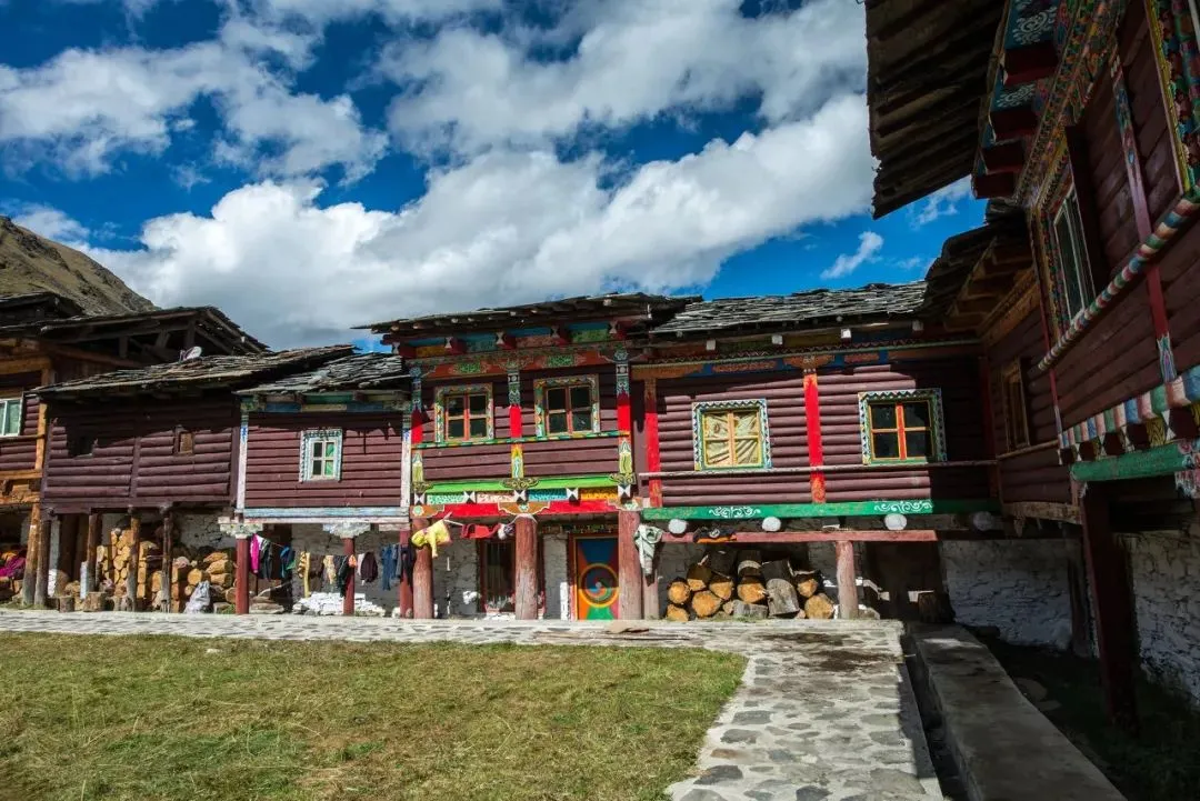 雪山、圣湖、蓝天、原野,宁静村落、漫漫花海,扎尕那隐藏在崇山峻岭中的藏族村落,藏式榻板木屋鳞次栉比,层叠而上,经幡迎风飘扬。