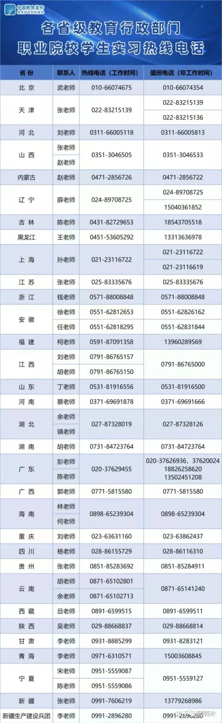 为进一步规范职业院校学生实习管理,维护实习各方的合法权益,发挥社会公众监督作用,根据《职业学校学生实习管理办法》《职业院校学生实习管理准则》等有关要求,现将教育部和各省级教育行政部门职业院校学生实习热线电话予以公告。热线电话专门受理职业院校学生实习管理方面政策咨询、建议和有关问题反映,我们将严格按照有关规定办理,并为来电人保密。