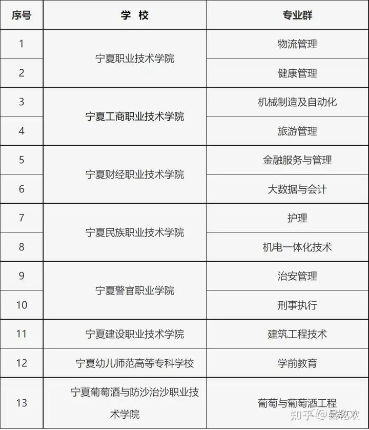 其中提到,拟立项宁夏工商职业技术学校、宁夏财经职业技术学校、宁夏民族职业技术学校、宁夏警官职业学校4所学校为高水平高职学校,物流管理、健康管理、护理、葡萄与葡萄酒工程、机械制造及自动化等13个专业群为高水平专业群。