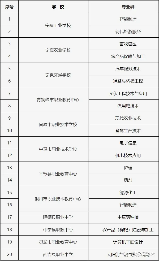 拟立项宁夏工业学校、宁夏农业学校、平罗县职业教育中心、固原市职业技术学校、青铜峡市职业教育中心、宁夏交通学校、中卫市职业技术学校、银川市职业技术教育中心8所学校为优质中职学校,畜牧兽医、现代农业技术、电子信息等20个专业群为优质专业群。