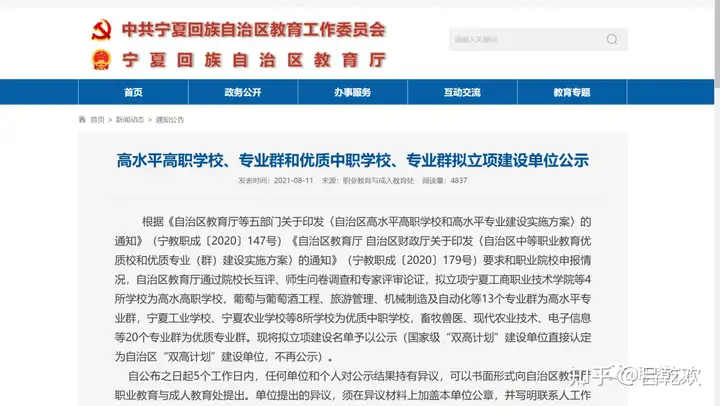 近日,宁夏回族自治区教育厅发布关于高水平高职学校、专业群和优质中职学校、专业群拟立项建设单位公示。