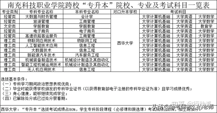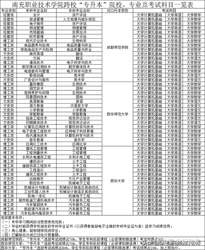 南充职业技术学校跨校“专升本”院校、专业及考试科目一览表