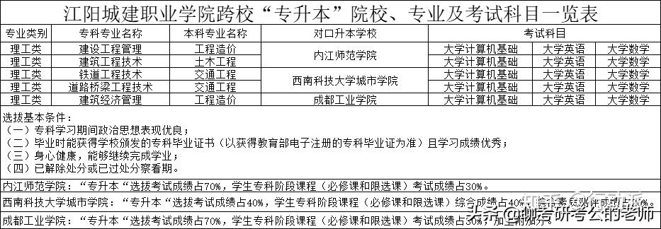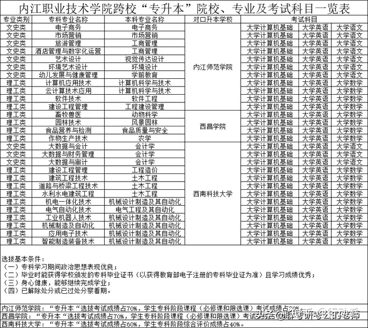 内江职业技术学校跨校“专升本”院校、专业及考试科目一览表