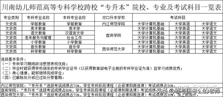 川南幼儿师范高等专科学校跨校“专升本”院校、专业及考试科目一览表