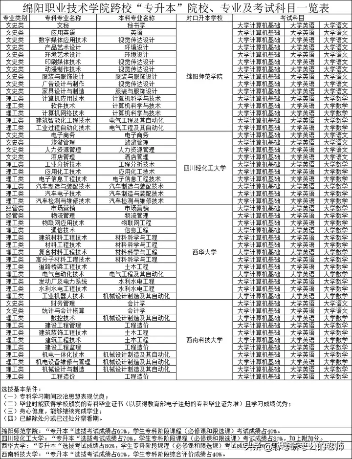 绵阳职业技术学校跨校“专升本”院校、专业及考试科目一览表