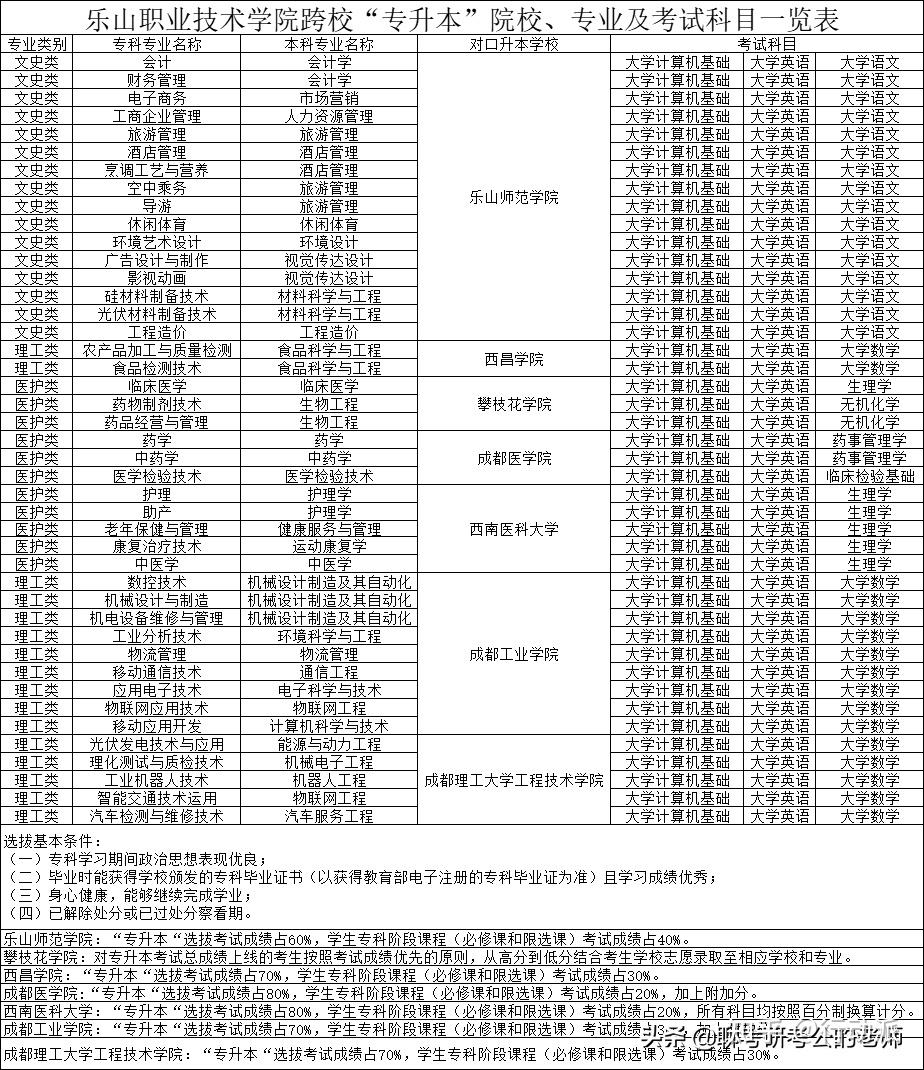 乐山职业技术学校跨校“专升本”院校、专业及考试科目一览表
