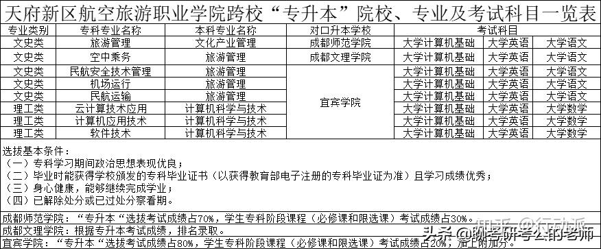 天府新区航空旅游职业学校跨校“专升本”院校、专业及考试科目一览表