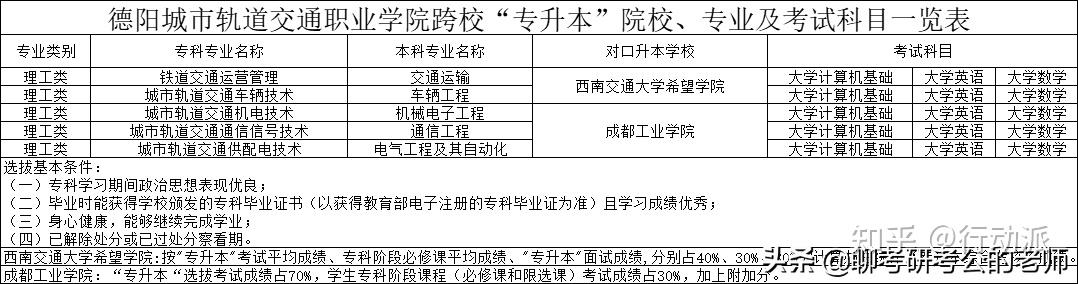 德阳城市轨道交通职业学校跨校“专升本”院校、专业及考试科目一览表