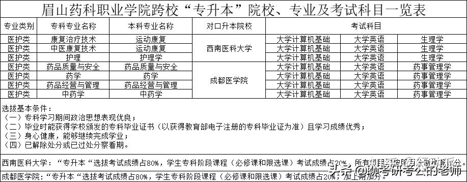 眉山药科职业学校跨校“专升本”院校、专业及考试科目一览表