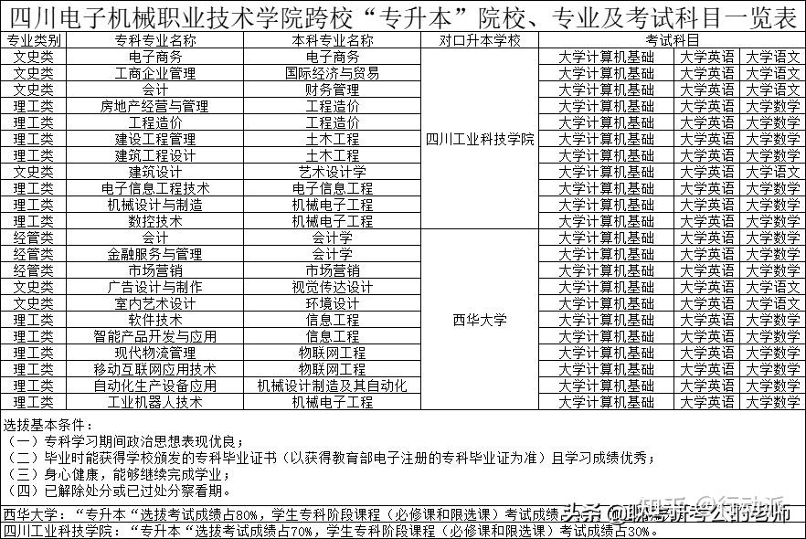 四川电子机械职业技术学校跨校“专升本”院校、专业及考试科目一览表