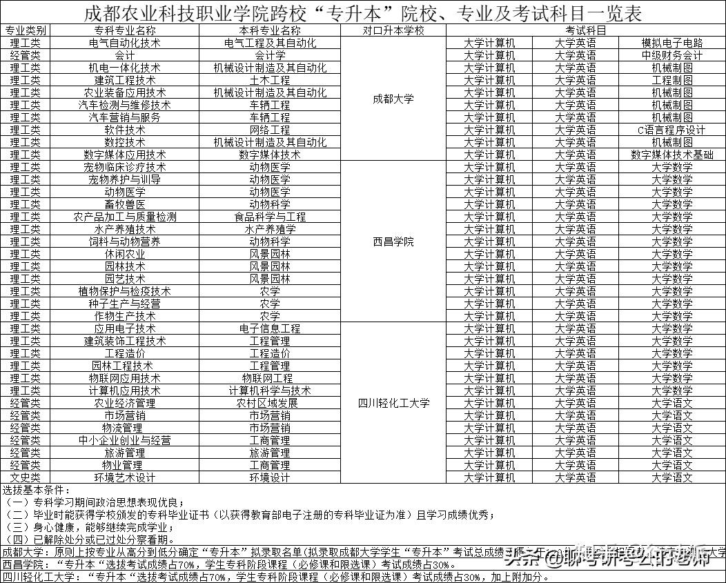 成都农业科技职业学校跨校“专升本”院校、专业及考试科目一览表