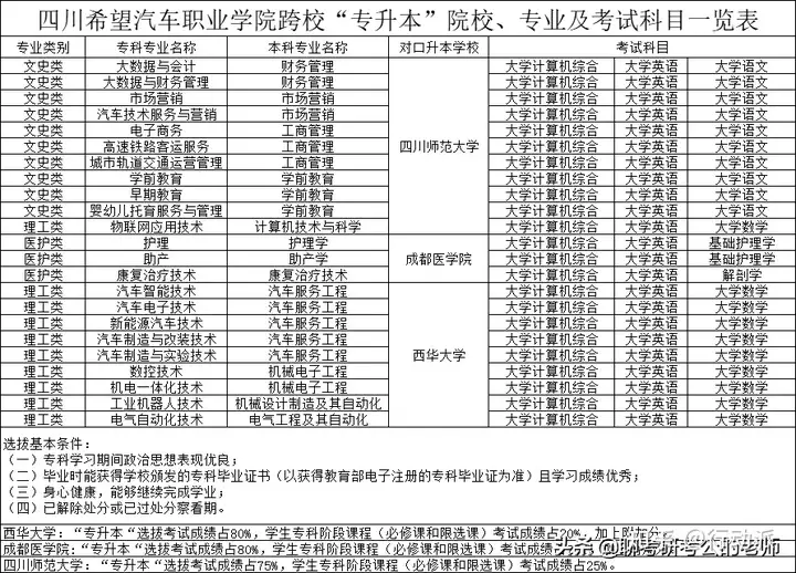 四川希望汽车职业学校跨校“专升本”院校、专业及考试科目一览表