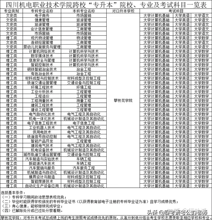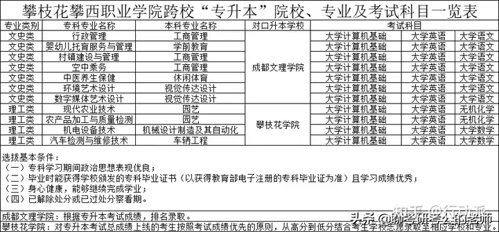 攀枝花攀西职业学校跨校“专升本”院校、专业及考试科目一览表