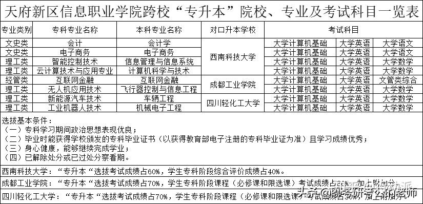 天府新区信息职业学校跨校“专升本”院校、专业及考试科目一览表