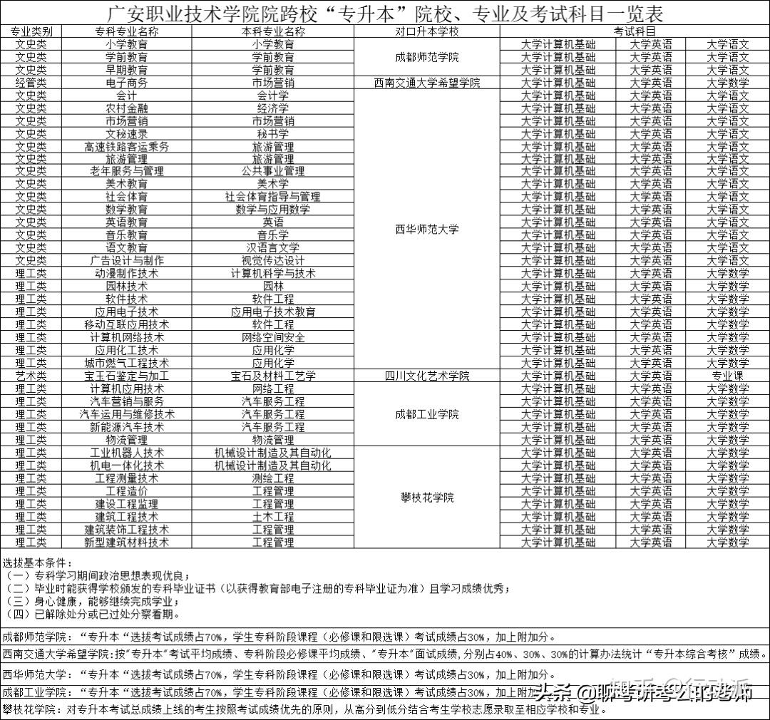 广安职业技术学校院跨校“专升本”院校、专业及考试科目一览表