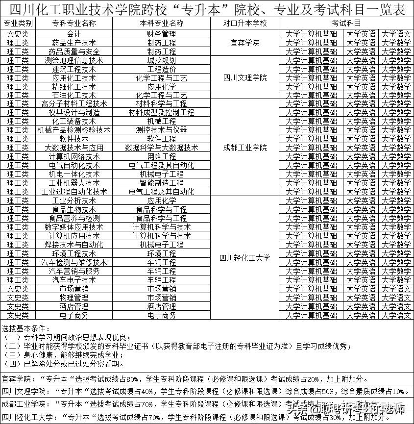 四川化工职业技术学校跨校“专升本”院校、专业及考试科目一览表