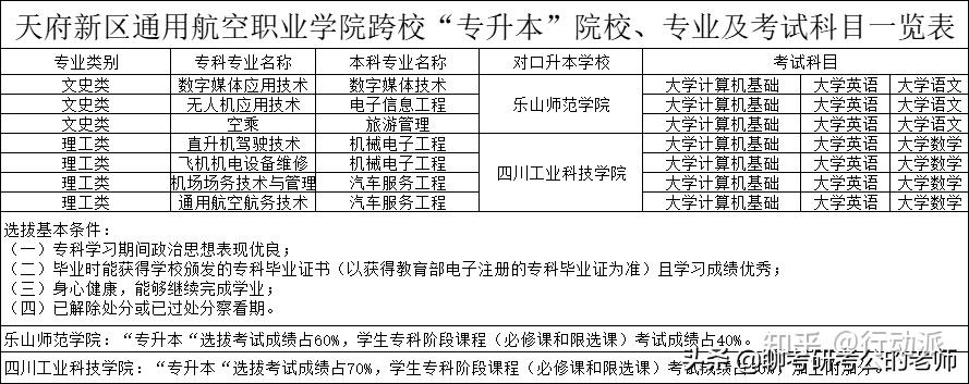 天府新区通用航空职业学校跨校“专升本”院校、专业及考试科目一览表