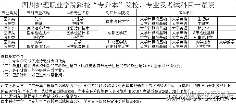 四川护理职业学校跨校“专升本”院校、专业及考试科目一览表