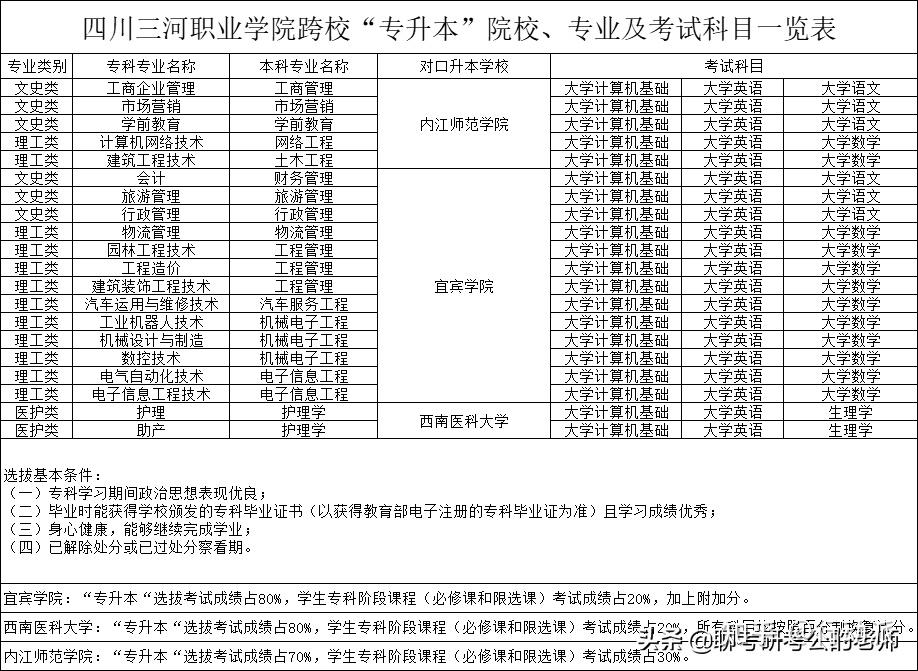 四川三河职业学校跨校“专升本”院校、专业及考试科目一览表